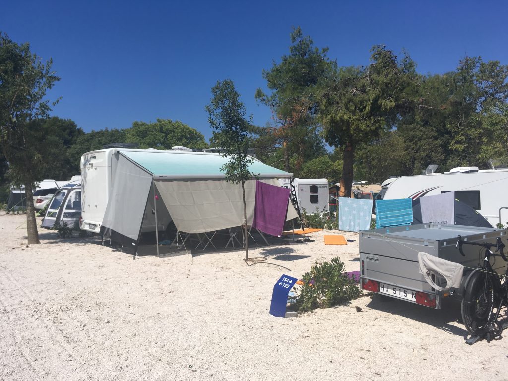 Der Platz hier ist erst im Juni eröffnet worden. Das Meer, die Sanitäranlagen und der Supermarkt sind super. Essen geht man besser außerhalb des Platzes. Die Parzellen sind schön groß, aber teilweise schwer zu erreichen. Es gab den einen oder anderen Unfall mit einem Baum während wir dort waren. Alles ist frisch mit Schotter aufgefüllt, leider nicht gut verdichtet. Nach zwei Tagen ist der KLEXi leicht über die Vorderreifen weg gesackt. Die Bucht hat einen Sandboden und wenn man ein wenig in dem flachen Wasser nach draußen schwimmt, kann man Steckmuscheln entdecken.