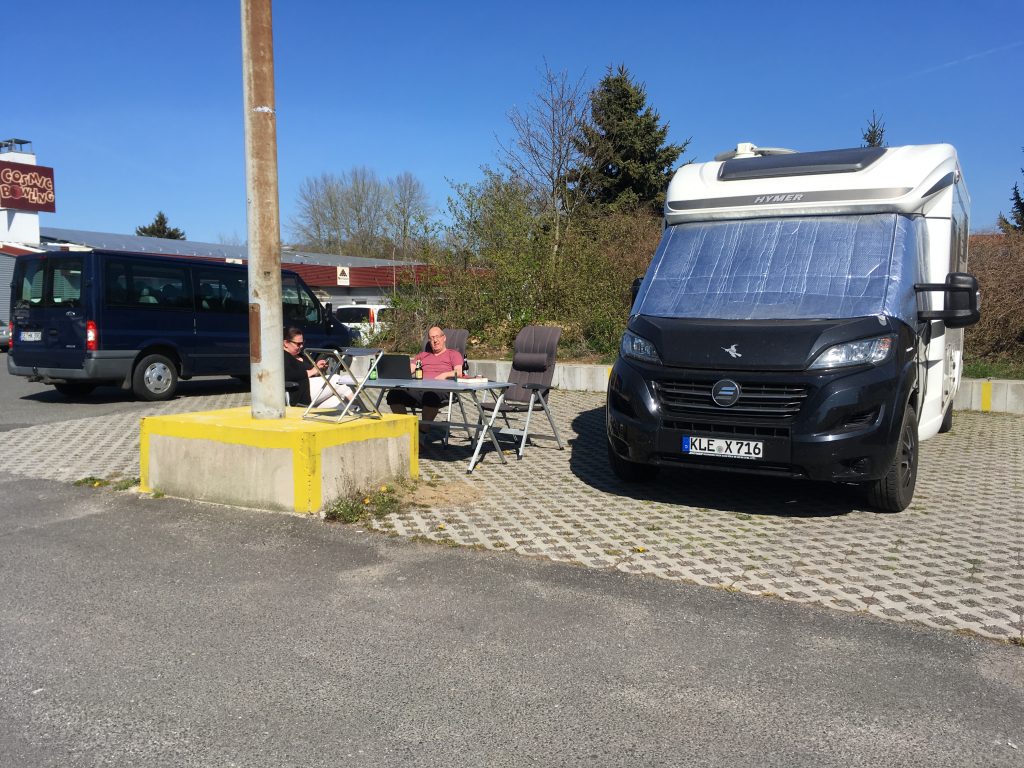 Am morgen meldet die Gasflasche schon wieder leer. Das wir mit dem Füllstand immer so einen Blindflug machen gefällt Dirk gar nicht. Der Platz hat sechs schmale Plätze die gerade sind. Der Rest ist größer, aber dafür schräg. Laut Aushang dürfen wir hier auch nur eine Nacht stehen. Der Patz liegt bei 11,-€ die man auf der Bowling Bahn bezahlen kann.