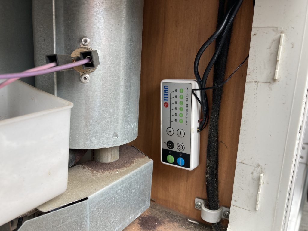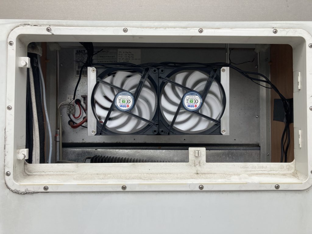 Nachdem am Leuker Meer der Kühlschrank zusammen gebrochen ist, mussten wir wieder die Abdeckungen abmachen. Durch den erhöhten Luftstrom konnte der Kühlschrank dann wieder arbeiten. Da das für uns aber keine Dauerlösung ist haben wir uns schlau gemacht und eine Lüftung eingebaut. Bis nach dem Sommerurlaub erst einmal provisorisch. Wenn es sich dort bewährt muss das Steuerungsteil nach innen verlegt werden. Die Temperaturabhängigen Leiselüfter gab es bei Amazon für ca. 80,-€