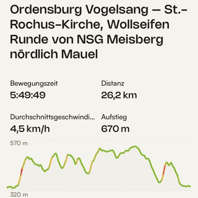 Irgendwie hat mich die letzte Woche wohl geschafft, denn mit Mühe habe ich bis 19:00 Uhr durchgehalten und dann bis 7:00 Uhr geschlafen. Da gab es wohl Nachholbedarf. Schon am Freitag hatte ich mir eine 26 km Wanderung raus gesucht und die bin ich dann auch angegangen. Es war nicht zu heiß und zwischendurch kamen sogar ein paar Tropfen, aber sonst war es vom Wetter her gut. Was mir zu schaffen machte war der Gegenwind und die Steigungen hatte ich total unterschätzt. Die bin ich leider viel zu schnell angegangen. Leider saß der linke Schuh wohl auch nicht richtig, jedenfalls habe ich eine daumengroße Blase an der Verse als Erinnerung an die Wanderung.