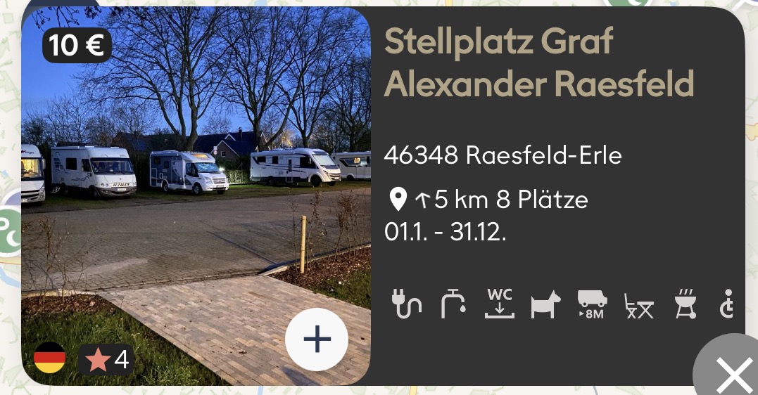 Am Donnerstag konnte ich wieder erst um 17:15 Uhr starten. Es ging über Land in Richtung Wesel, dann über den Rhein zum Stellplatz Graf Alexander Raesfeld. Leider bedingt die Uhrzeit viel Verkehr auf der Strasse. Irgendwie wollen alle nach Hause und ich wollte von Zuhause weg. So habe ich bis Wesel schon fast eine Stunde gebraucht. Um 18:50 Uhr war ich dann endlich auf dem Platz und konnte KLEXi auf eine der größzügigen Parzellen abstellen. Der Tacho zeigte 87.315 Km.